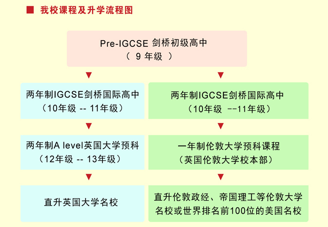 ■ 剑桥高中考试 我校是在剑桥考试的注册考试中心,学生完成课程以后,可以直接在本校参加英国考试局进行的IGCSE、GCE A Level相关科目的考试,该成绩受到世界上超过160个国家的数千所大学的认可,被誉为“国际高考”。