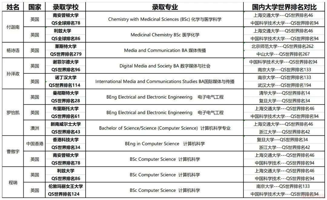 录取大学包括:英国伦敦大学学院、布里斯托、曼彻斯特大学、爱丁堡大学、谢菲尔德大学、利兹大学、南安普顿大学、埃克塞特、兰卡斯特大学、东英吉利大学、莱斯特大学、卡迪夫大学、拉夫堡大学、伦敦艺术大学、创意艺术大学等知名大学;加拿大多伦多大学、西蒙菲莎大学、西安大略大学、约克大学等,另外还有香港科技大学、澳大利亚新南威尔士、新西兰奥克兰大学等世界知名。
